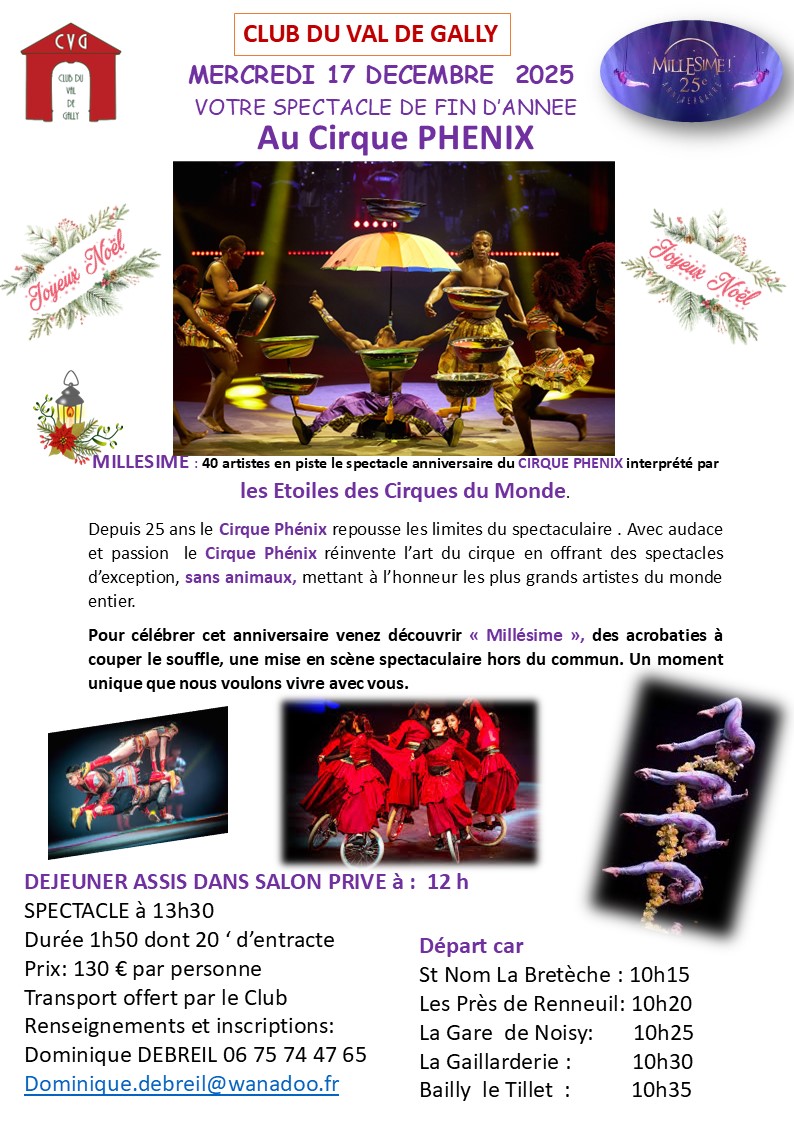 Rappel: Mercredi 17 Décembre, notre sortie au cirque « PHENIX » spectacle, et déjeuner dans un salon privé. Si vous le désirez, il nous reste 1 place.