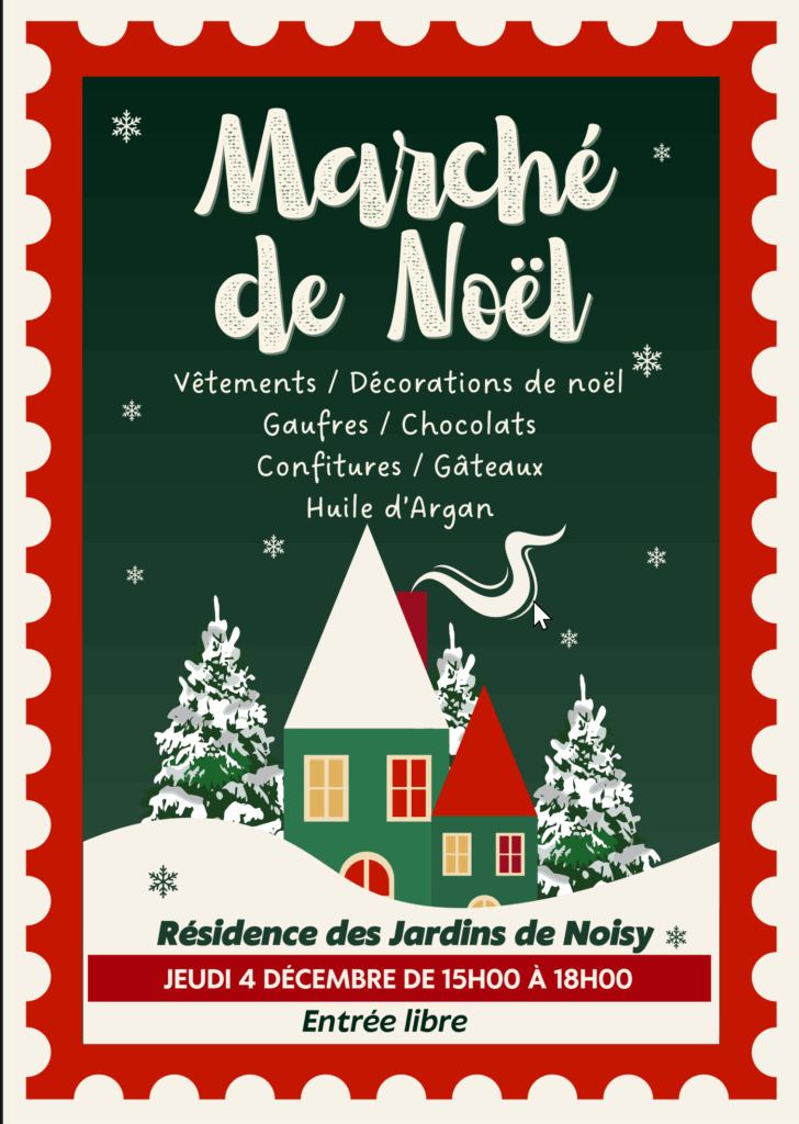 Marché de Noël 2025 Calendrier Quand : 4 décembre 2025 @ 15:00 – 18:00 2025-12-04T15:00:00+01:00 2025-12-04T18:00:00+01:00 Où : Résidence des Jardins de Noisy Coût : Gratuit